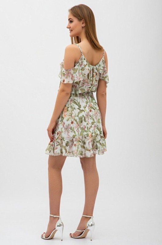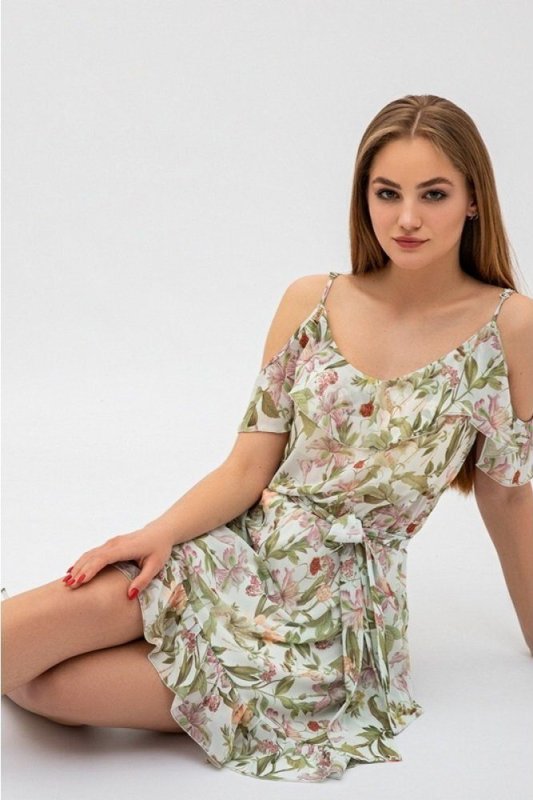 Сукня з ніжного шифону в квітковий принт на тонких регульованих бретелях і оборками на плечах та по низу виробу. Комплектується поясом з основної тканини. Підкладка з шифону.