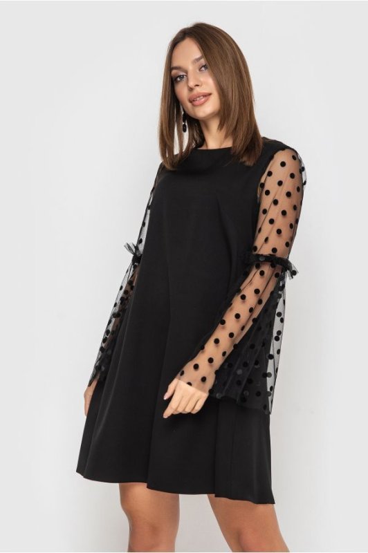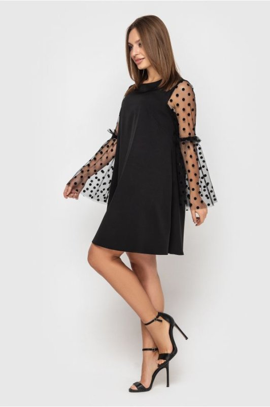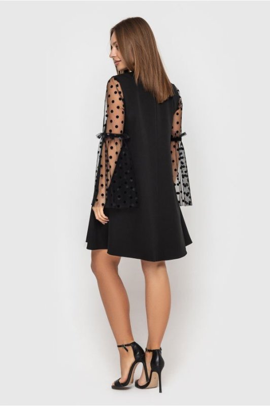 Вільне коктейльне плаття Алісія з об'ємними розкльошені рукавами з флокірованной сітки в горошок. Рукава доповнені декором у вигляді велюрових стрічок і сітки. Застібка-потайна блискавка по центру спинки.