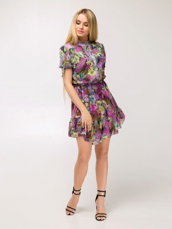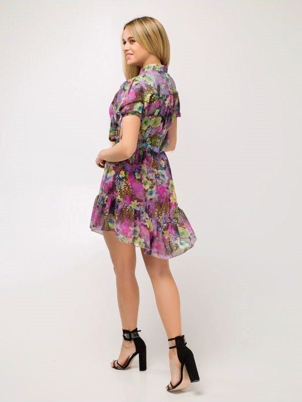 Літнє плаття Німфея з асиметричним подолом. Відрізна талія з еластичною вставкою. Спідниця на підкладці, по низу - волан. Застібається по переду на декоративні гудзики. Комір-стійка з зав'язками по центру. Рукав-ліхтарик з манжетом на гумці і зав'язками.
