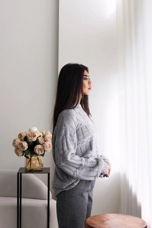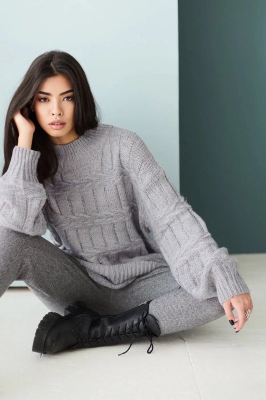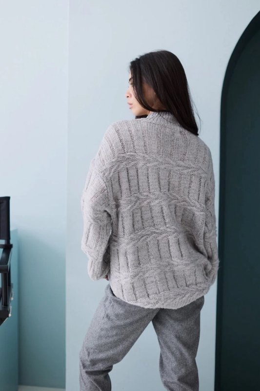 Теплий вільний светр чудово підійде на холодний період. Рукав вільний, довгий. Комірець стійка. Светр виконаний із щільної високоякісної в'язки.