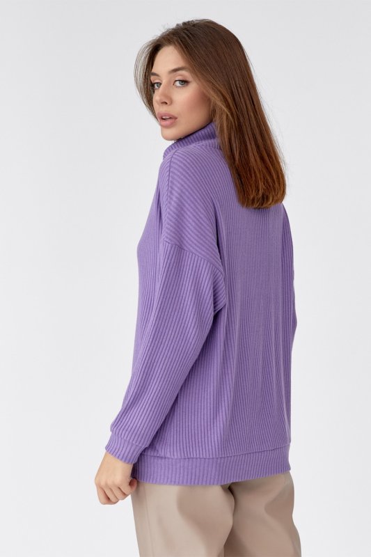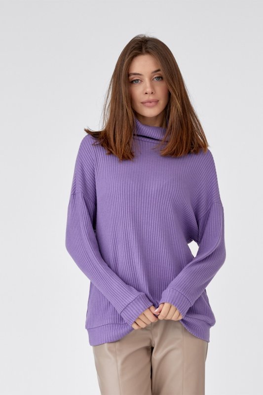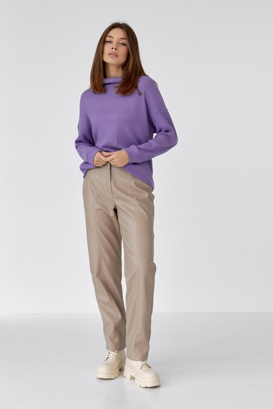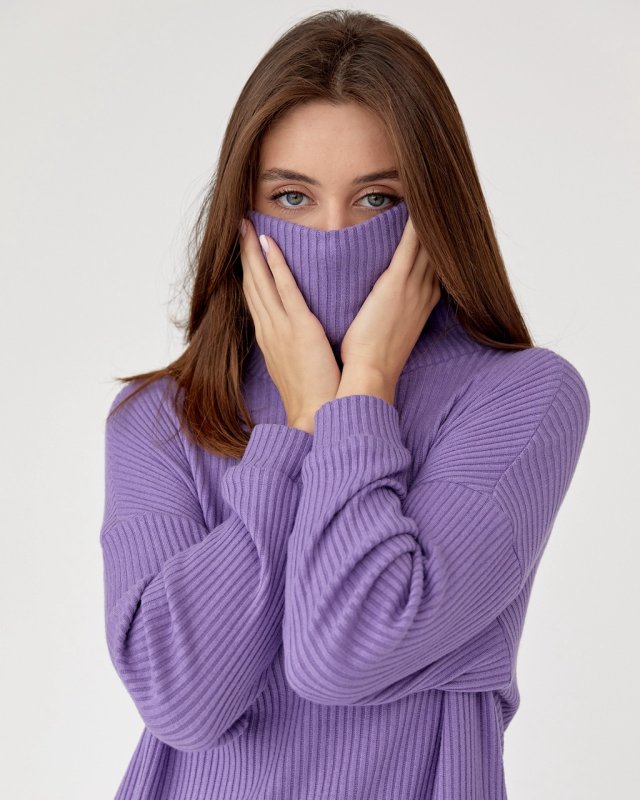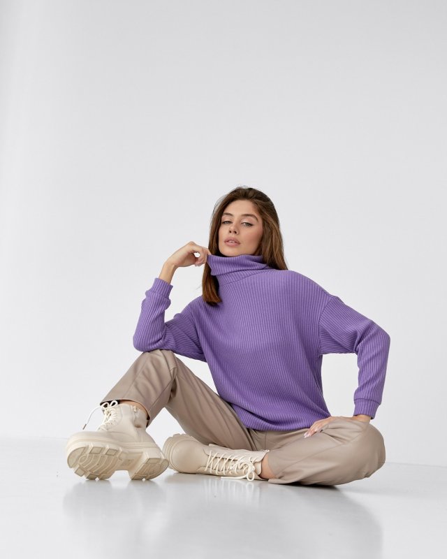 Теплий трикотажний светр із коміром хомут. Виріз горловини круглий. Рівень плеча приспущений, рукава втачні, довгі. По низу рукавів і виробу виконан манжет.