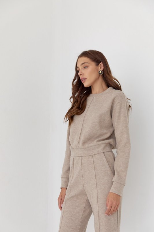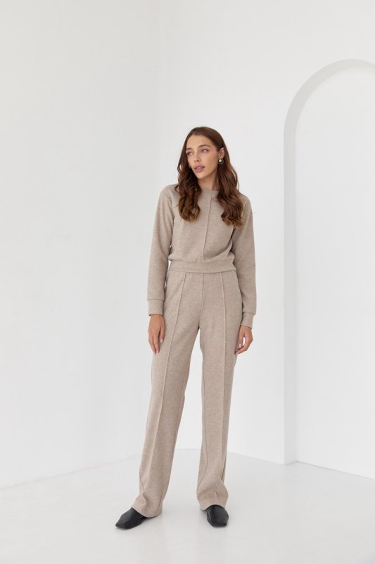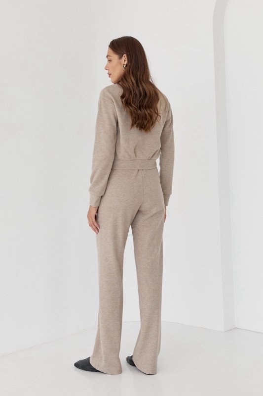 Теплий жіночій костюм з джемпера і штанів. Джемпер по низу з манжетом, спереді застрочений защіп. Виріз горловини круглий, з планочкою. Рівень плеча спущений, рукава вшивні, довгі, з манжетом по низу. Штани прямі, на талії пояс із резинкою. Кишені з відрізним бочком. Передні половинки зі стрілками, які зафіксовані строчкою.