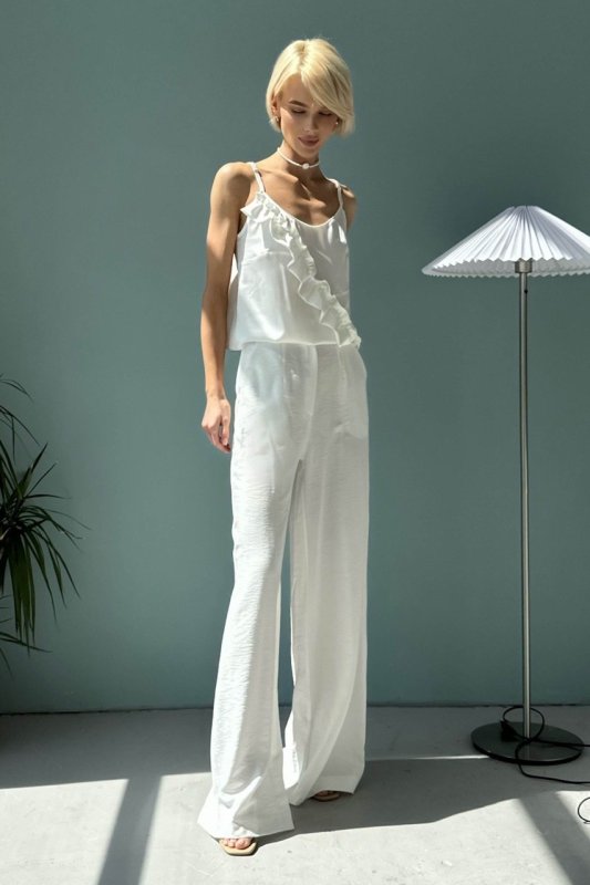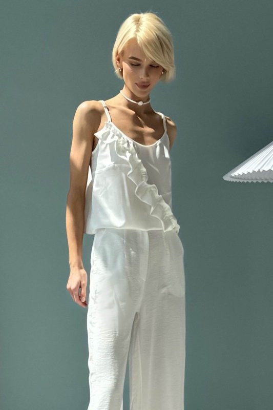Оригінальний топ із штучного шовку «Армані». Тонкі бретелі, що регулюються, ніжна рюша по переду – модель підійде як для створення романтичних вечірніх образів, так і для повсякдення.