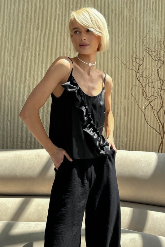 Оригінальний топ із штучного шовку «Армані». Тонкі бретелі, що регулюються, ніжна рюша по переду – модель підійде як для створення романтичних вечірніх образів, так і для повсякдення.