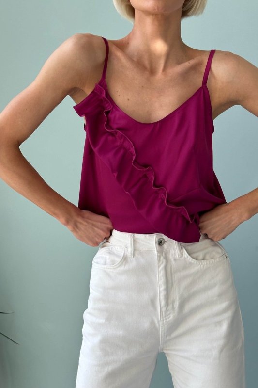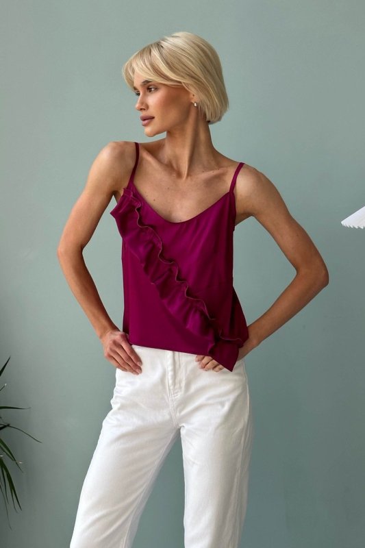 Оригінальний топ із штучного шовку «Армані». Тонкі бретелі, що регулюються, ніжна рюша по переду – модель підійде як для створення романтичних вечірніх образів, так і для повсякдення.