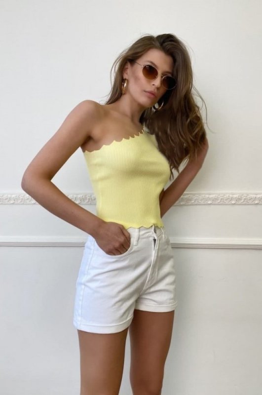 Легкий асиметричний топ прикрашений хвилястим краєм. Топ на одне плече виглядає ефектно, додає яскравий акцент образу. Вироблено в Туреччині.
