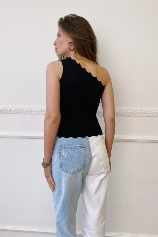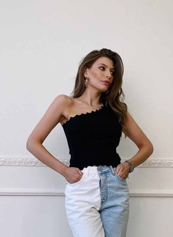 Легкий асиметричний топ прикрашений хвилястим краєм. Топ на одне плече виглядає ефектно, додає яскравий акцент образу. Вироблено в Туреччині.