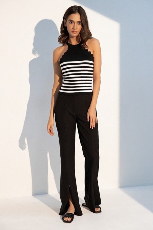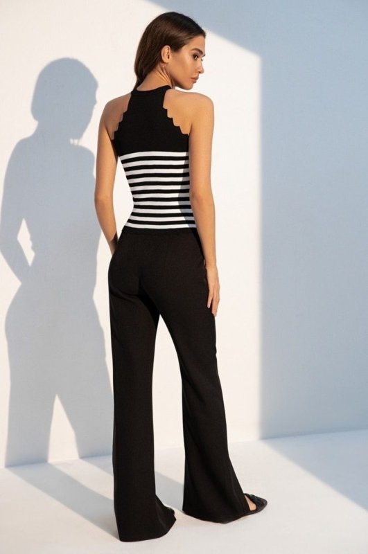 Топ в смужку з приємного до тіла трикотажу. Горловина в стилі "гумка" відмінно утримує топ і роблять ключицю досить витонченою. Родзинка моделі-хвилясті краї. Топ без рукава-кращий варіант для спекотного літа, а в прохолодний день на плечі можна накинути строгий жакет. Вироблено в Туреччині.