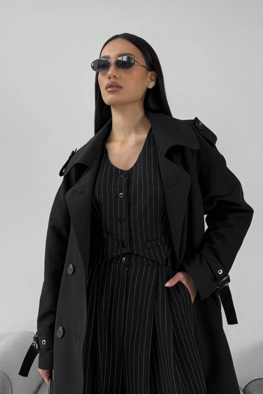 Двобортний тренч на підкладі, застібається на ґудзики в тон, по спинці щліца в розрізі, що застібається на ґудзики.