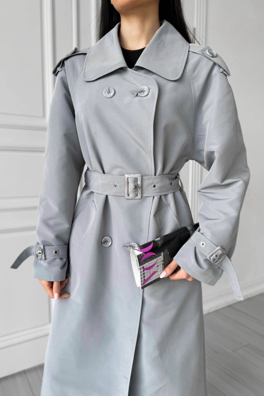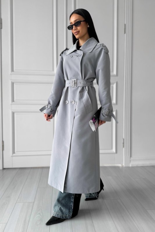 Двобортний тренч на підкладі, застібається на ґудзики в тон, по спинці щліца в розрізі, що застібається на ґудзики.