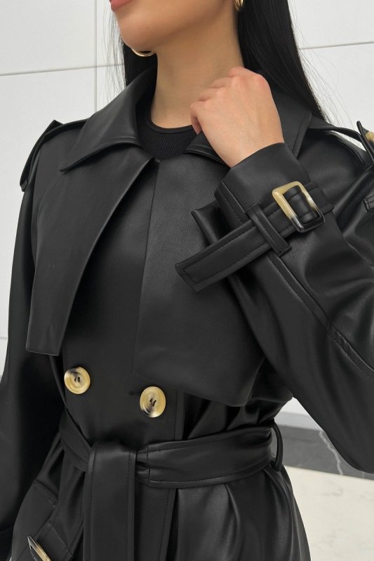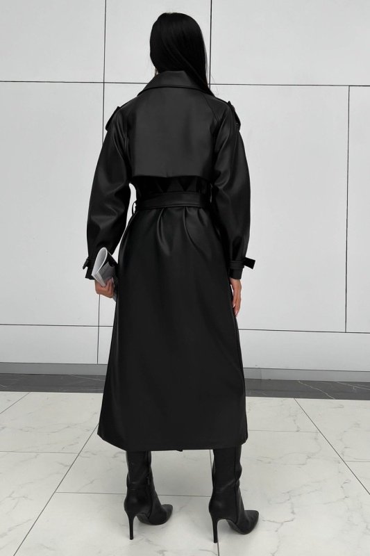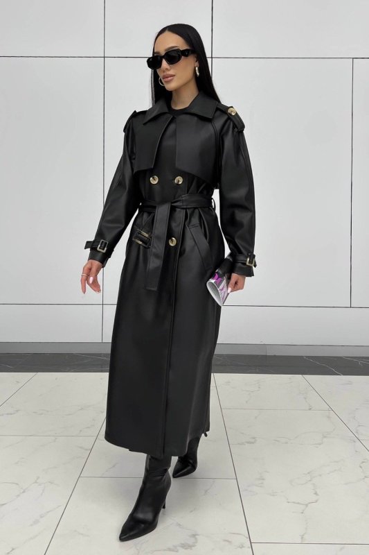 Для тренчу вибрали гладку та м'яку екошкіру. Тренч на підкладі, застібається на об'ємні ґудзики. Модель доповнена оригінальними декоративними елементами – відлітні кокетки по переду і спинці, погони на плечах.