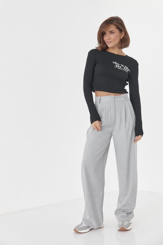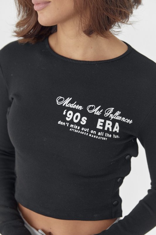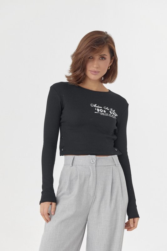 Модель виконана із щільного трикотажу у дрібний рубчик, з довгими рукавами та прямим низом. Кругла горловина обшита окантовкою і спереду, на грудях, кофточка прикрашена буквеним принтом. Бічні шви у виробі застібаються на кнопки.