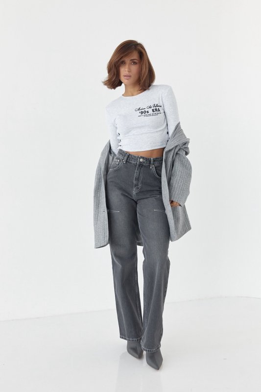 Трикотажна кофта в рубчик з принтом - 8735 сіра