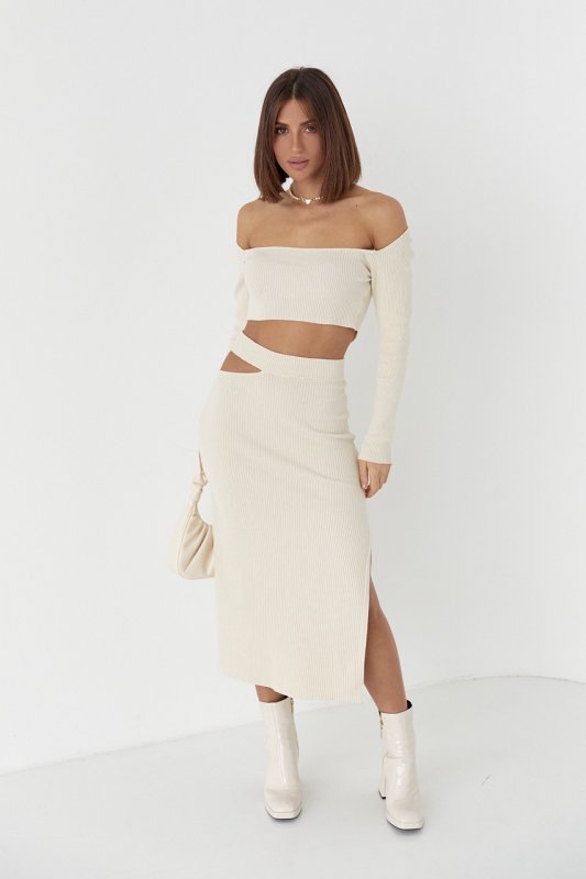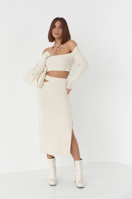 Укорочена кофточка в рубчик з квадратною горловиною, підкреслить вашу жіночність, а приталена спідниця довжини міді, ідеально фіксується на талії завдяки ефектному поясі-резинці. Приємна до тіла тканина – щільний трикотаж з еластичним ефектом, додасть вам комфорту та зігріє у прохолодний день.
