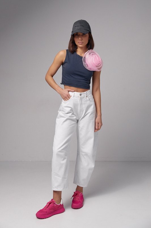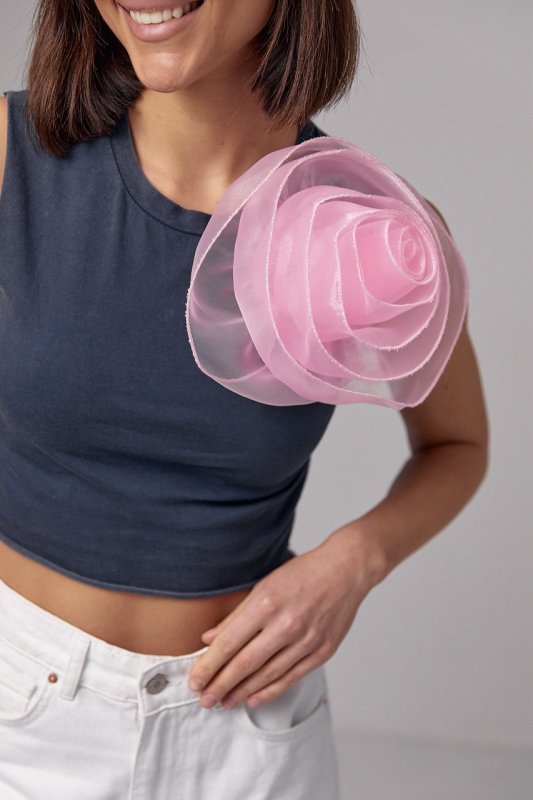 Особливістю цього топу є велика об'ємна квітка, яка створює враження тривимірності і надає виробу вишуканого вигляду. Квітка кріпиться до футболки за допомогою клейкої основи. Виріб має вільний крій, укорочений фасон, бейку на круглій горловині та необроблені краї на проймах та по низу.