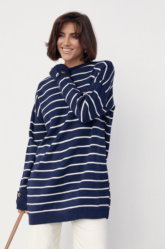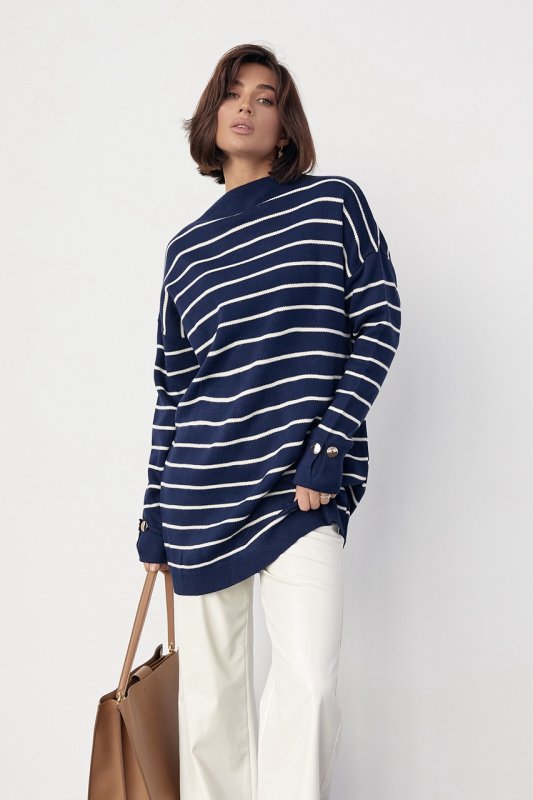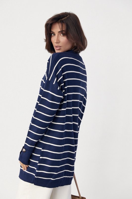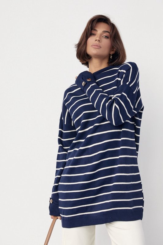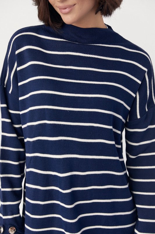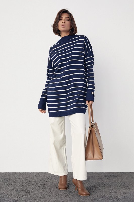 Ця модель у стилі оверсайз повністю прикрашена смужками, а внизу та на довгих рукавах доповнена однотонною в'язкою у вигляді манжети. Короткий однотонний комір-стійка на круглій горловині також обшитий тоненькою резиночкою. Пройми у виробі опущені. Довгі рукави по низу мають відвороти, які закріплені двома золотистими гудзиками.