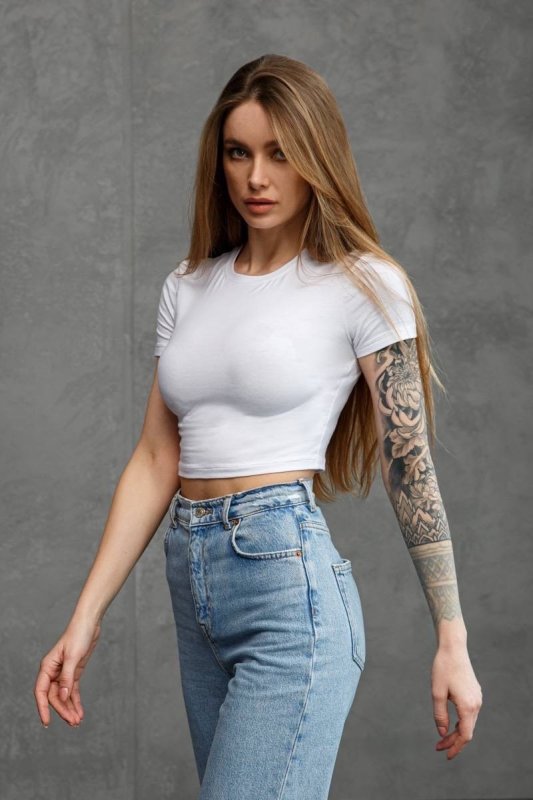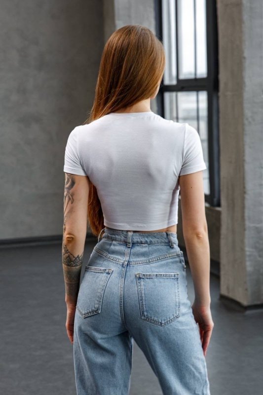 Укорочена футболка силуету, що облягає, - ідеальний вибір для створення сучасного і стильного образу. Виконана з м'якого матеріалу, який приємний на дотик та забезпечує комфортну посадку. Ця футболка відмінно підходить для поєднання з джинсами або спідницею та стане незамінною річчю у гардеробі кожної модниці. Виміри в нерозтягнутому стані