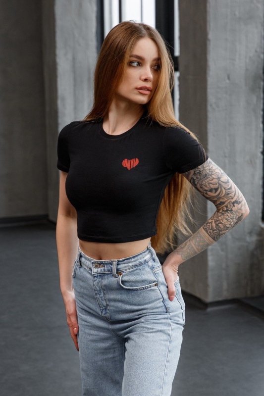 Укорочена облягаюча футболка силуету - ідеальний вибір для створення сучасного та стильного образу. Виконана з м'якого матеріалу, який приємний на дотик і забезпечує комфортну посадку. Ця футболка чудово підходить для суміщення з джинсами або спідницею і стане незамінною річчю в гардеробі кожної модниці. Вимірювання у нерозтягнутому стані