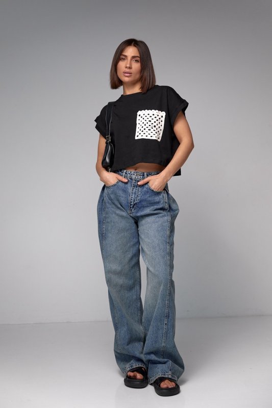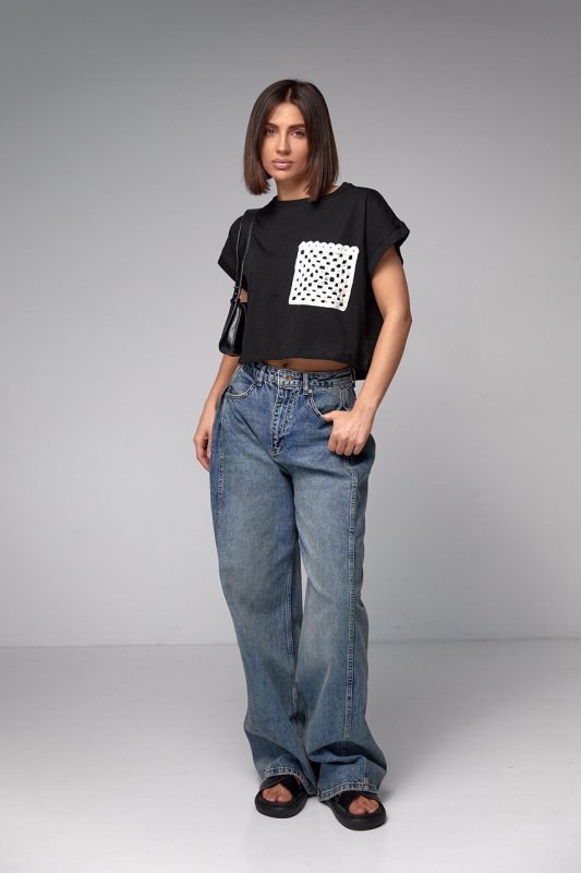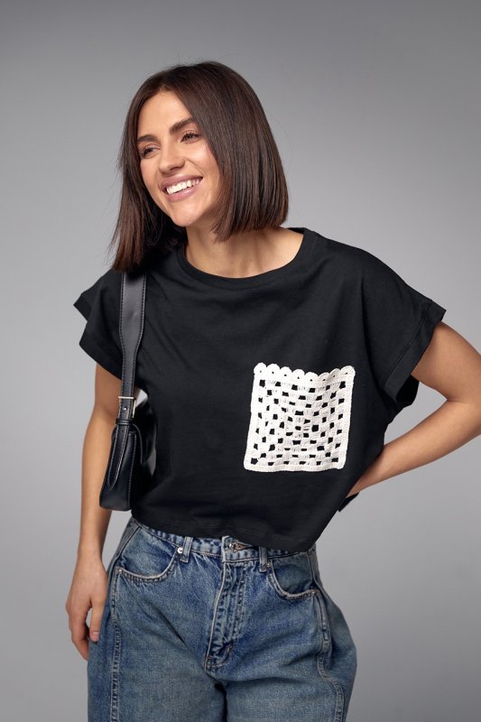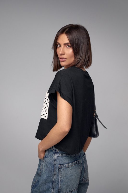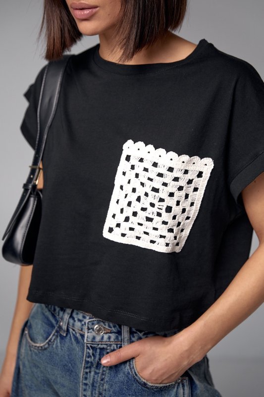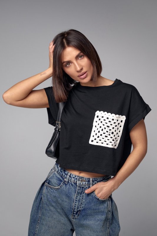Укорочена футболка з ажурною кишенею - 08756 чорна