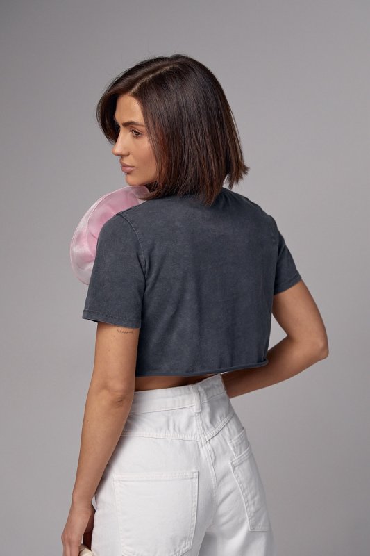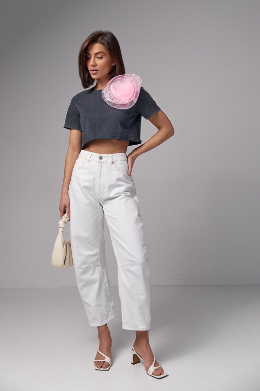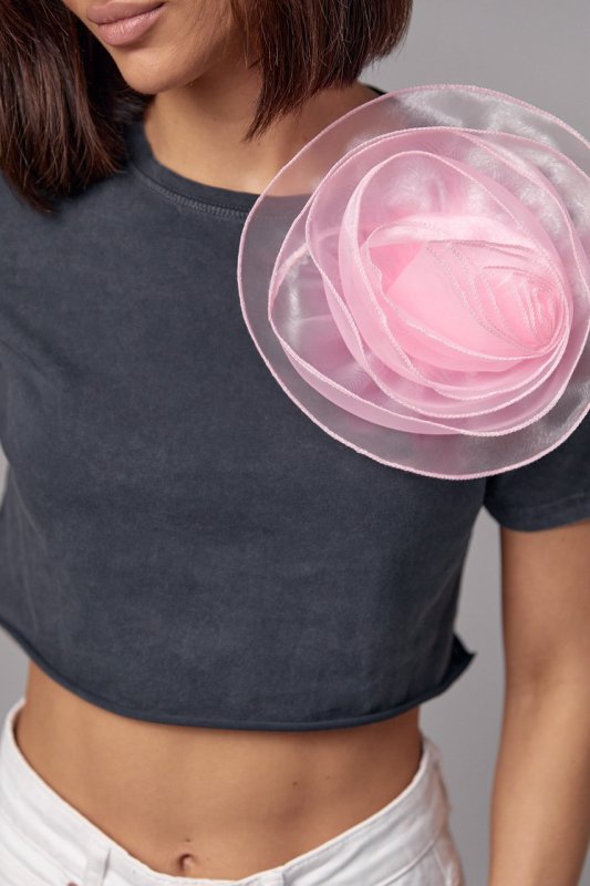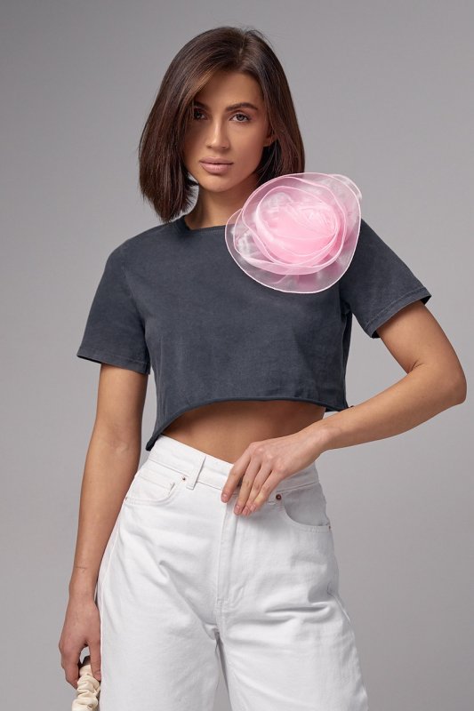 Укорочена футболка прикрашена об'ємною квіткою - 134567
