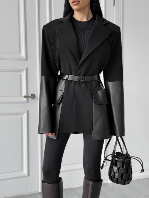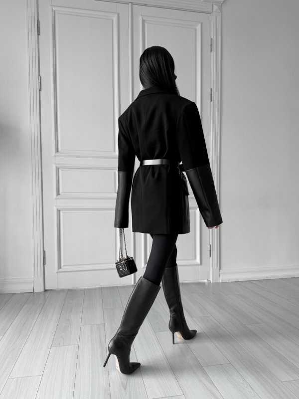 Нова модель прямого крою owersize чудово сяде по фігурі. Застібка – на потайний гачок по переду. Гармонійне поєднання якісної еко-шкіри та якісної костюмної тканини створюють не перевершений силует.