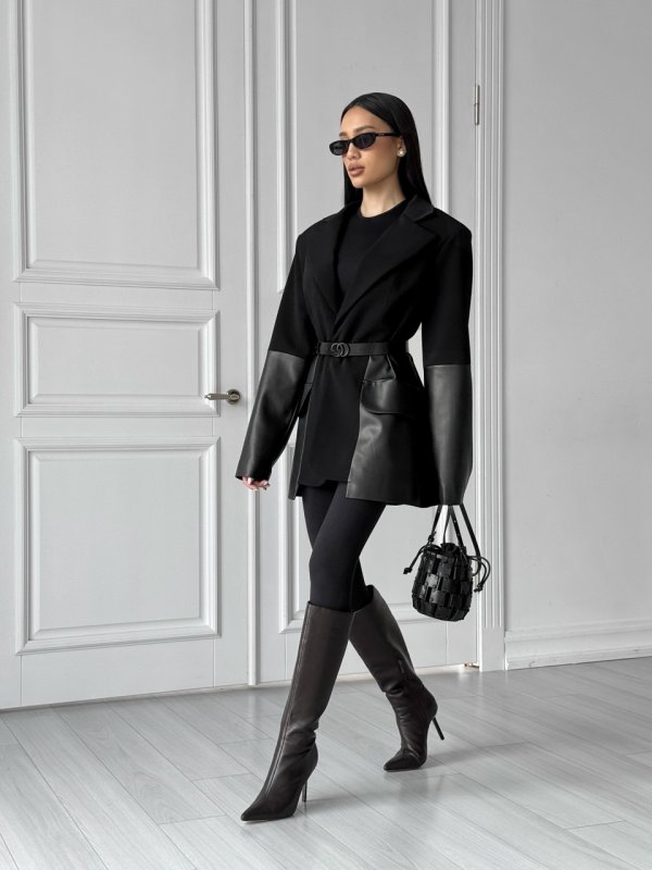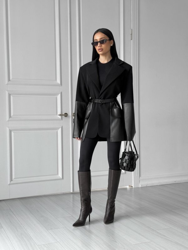- Декоративні елементи: поєднання шкіри та костюмки, фігурний низ, об’ємні плечі