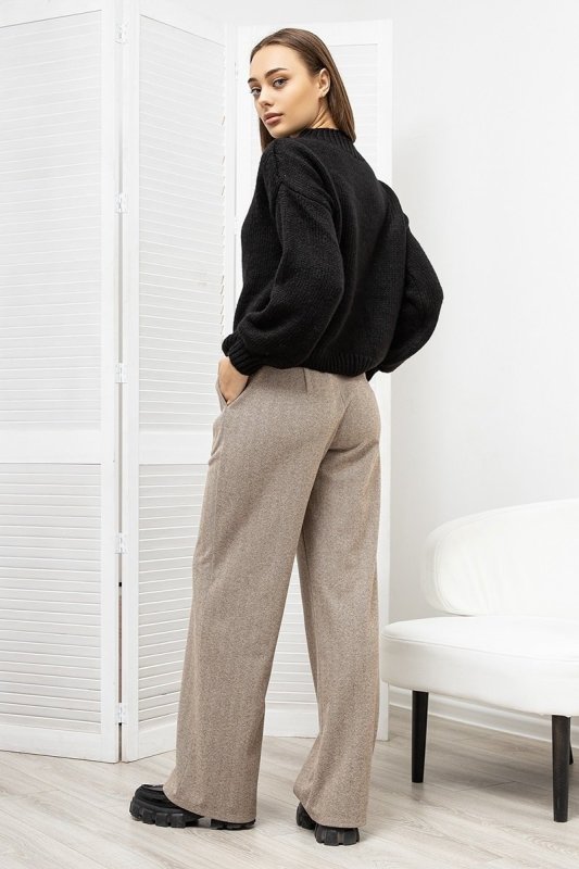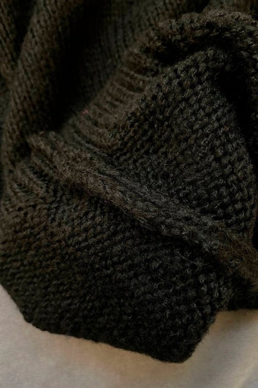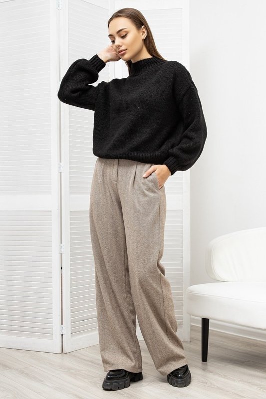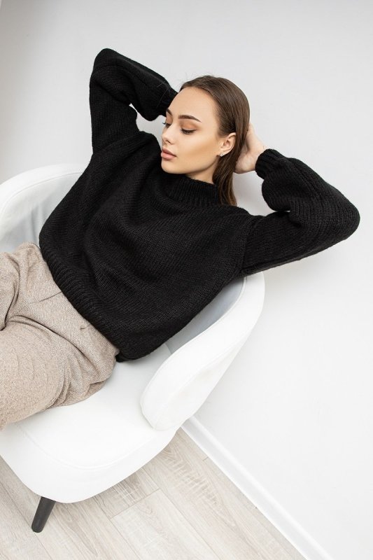 В'язаний укорочений светр в стилі oversize з коміром стійкою. Комір, манжети і низ виробу виконані гумкою.