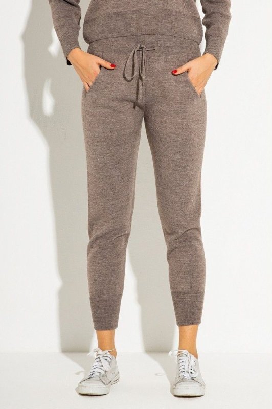 Трикотажні штани-джоггери середньої посадки з еластичною вставкою на талії, зав'язками і двома кишенями в бічних швах.