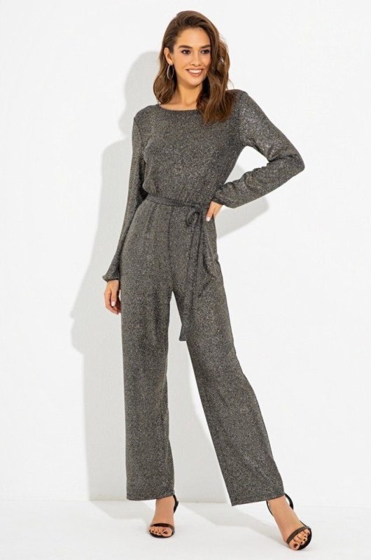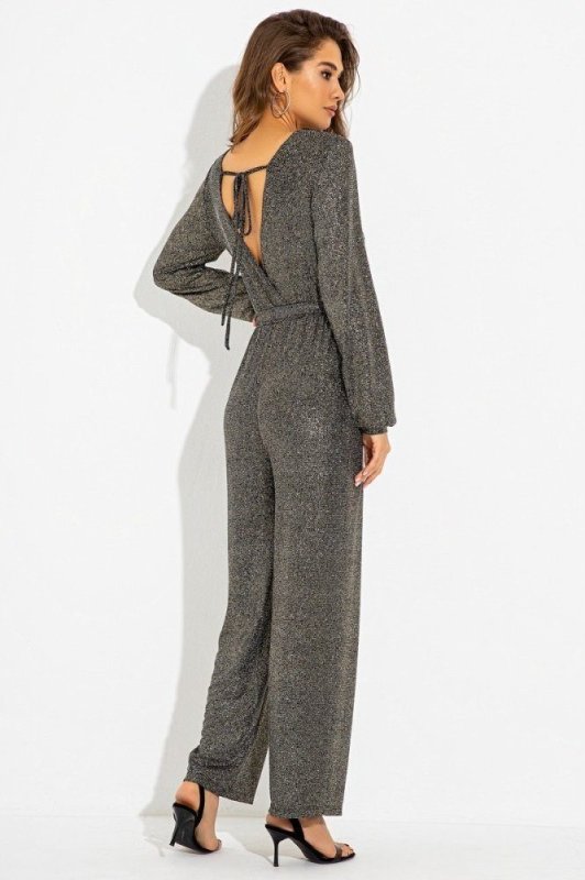 Вечірній комбінезон з приємного до тіла трикотажу з мерехтливими частинками. Відкрита спинка, об'ємний рукав і штани прямого крою надають особливий шик жіночого образу. Особливістю моделі є легкість і легкість, здатність додати розкутість і грайливість зовнішньому вигляду. Шикарний наряд можна надіти на випускний вечір, ювілей, презентацію, модний показ і будь-який святковий захід.