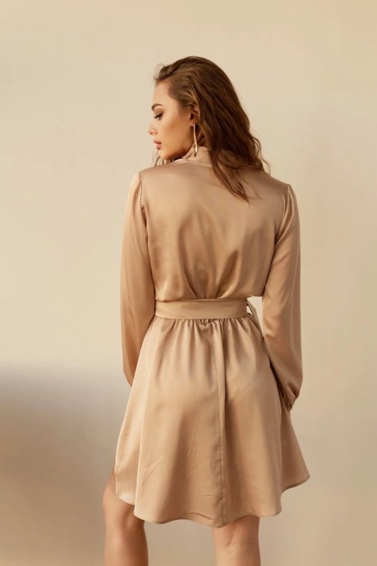 Повітряна сукня у ніжному кольорі йде на запах. Талія підвищена, спідниця пишна, розкльошена. Горловина має V-подібний виріз. Рукав довгий, пишний. Пояс знімний.