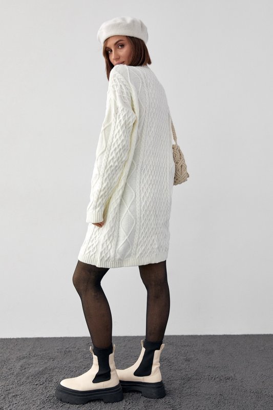 Ця модель виконана з хусткового в'язання і прикрашена візерунками з крупних косичок і ромбів. Круглий комір, манжети прямого низу та довгих рукавів виконані з в'язки у широкий рубчик. Лінія плеча подовжена.