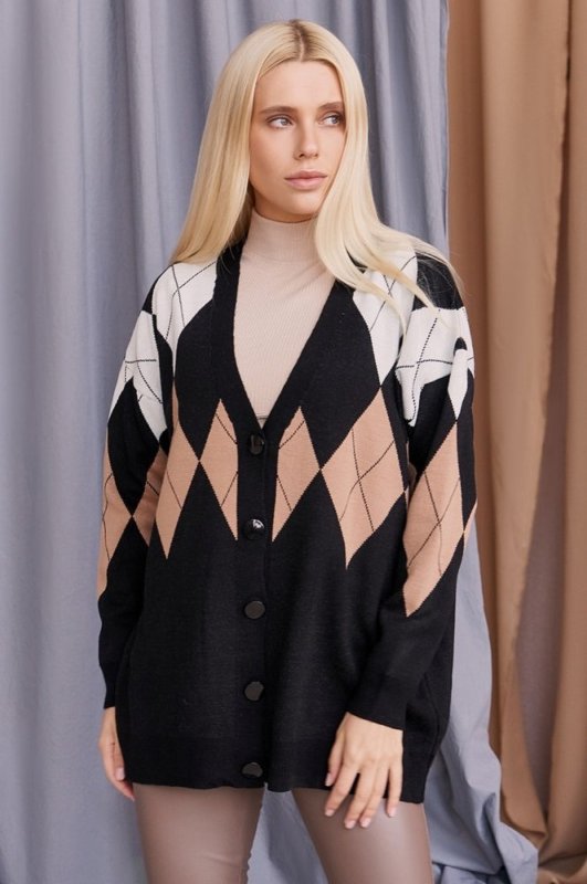Подовжений кардиган в візерунок" Ромб " зі спущеною лінією плечового шва. Застібається на гудзики. Його можна носити в будь-який період року і комбінувати з різними речами. Зручний і функціональний. Вироблено в Туреччині.