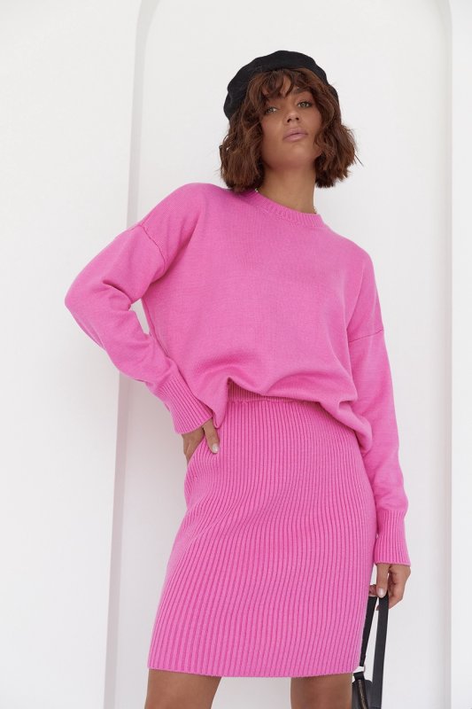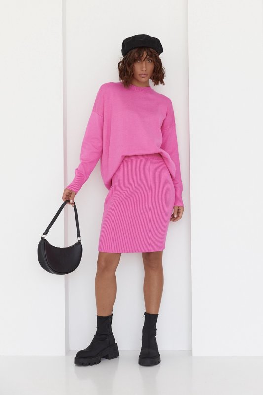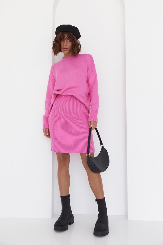 Модель зшита з теплої та дуже приємної до тіла пряжі. У спідниці прямий низ та широка резинка в поясі. Завдяки рубчистій текстурі тканини, спідниця відмінно тримає форму і видовжує силует. Джемпер в стилі оверсайз, довгі рукави, пройми опущені. Краї низу фігурні, горловина доповнена коміром із тканини, складеної вдвоє.