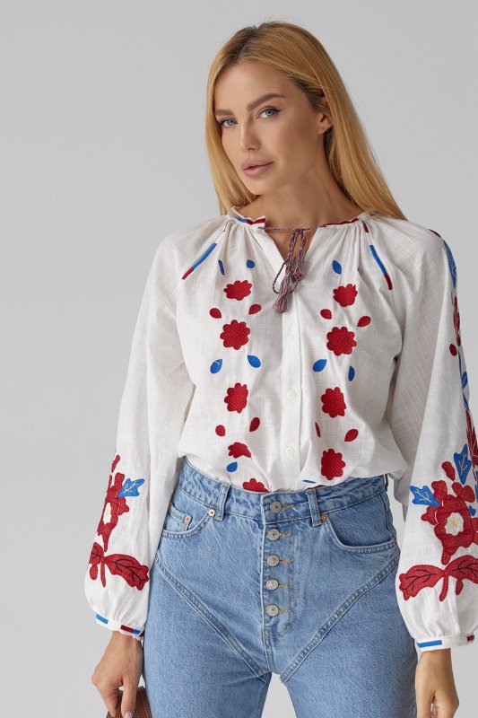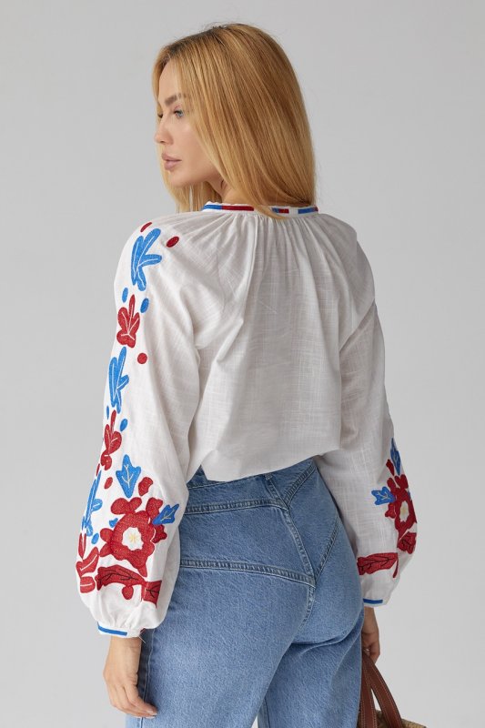 У моделі низ прямий, а кругла горловина доповнена вишитою окантовкою. Довгі рукави-реглани внизу зібрані в манжети без застібки. Основна частина об'ємних рукавчиків та полочка спереду декорована квітковими мотивами з машинної вишивки гладдю. Спереду, біля пройм, також є вишивка, а по центру розташована вертикальна планка на гудзиках.