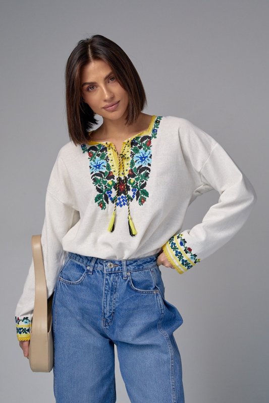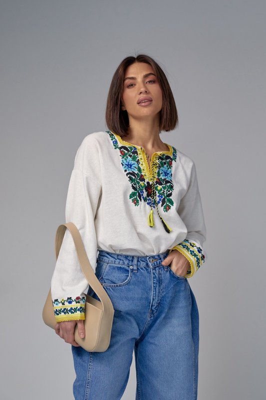 Ця сучасна жіноча вишиванка легко впишеться у ваш гардероб, роблячи кожен look особливим. Все завдяки квітковій вишивці та мереживу, якими прикрашена блузка.