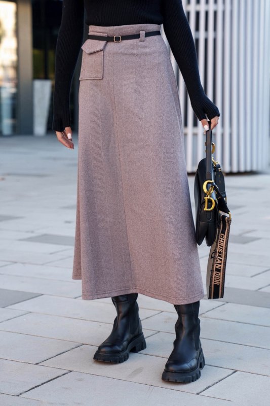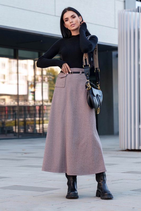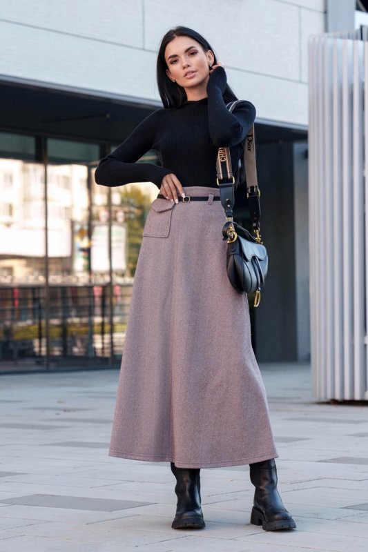 Тепла міді-спідниця А-силуету із щільної тканини - знахідка для осіннього та зимового гардеробу. Лаконічний стиль буде доречний і зі світлою сорочкою або жакетом, і з контрастною водолазкою. А універсальна довжина спідниці дозволяє носити її з різним взуттям. Враховуючи нейтральне забарвлення, таку спідницю легко можна вписати в офісний гардероб.