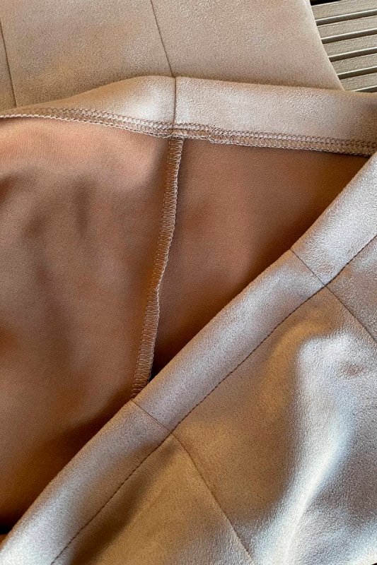 Замшеве вечірнє плаття довжини міні з акуратною стійкою на горловині. Сукня з відкритою спинкою. Застібається на гудзики ззаду. Родзинкою сукні є камені розташовані на спинці і на вирізі плеча. Замшеве вечірнє плаття-вишуканий і святковий варіант, який підкреслює жіночні обриси силуету своєї власниці.