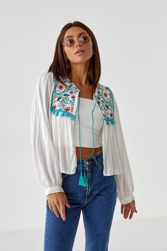 У моделі довгі рукави внизу зібрані на манжети з ґудзиком. На полочці присутня чарівна вишивка, яка є і на спинці виробу. Спереду, по центру, вишиванка зав'язується на шовкові зав'язки. Низ виробу прямий.