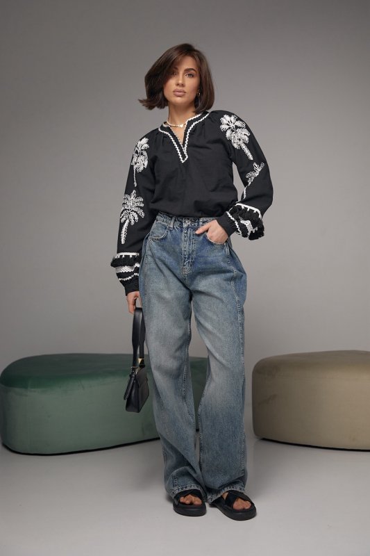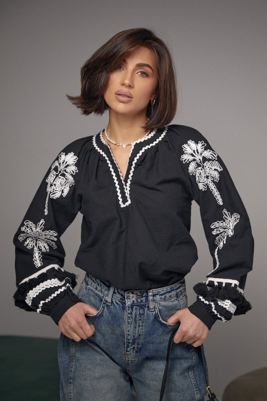 У моделі довгі рукави-реглани прикрашені аплікацією у вигляді пальм і зібрані на манжет із ґудзиком. Внизу рукавчики прикрашені хвилястою тасьмою та китицями. Така ж тасьма присутня на горловині, яка переходить у коротку планку із застібками-гудзиками. Низ блузи прямий.