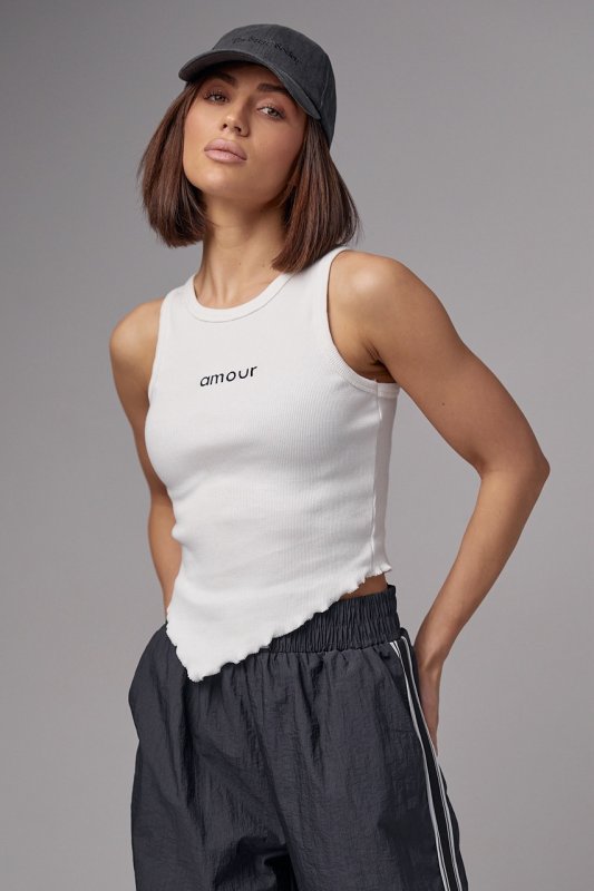 Майка жіноча в рубчик з асиметрією і написом Amour - 29621 молочна
