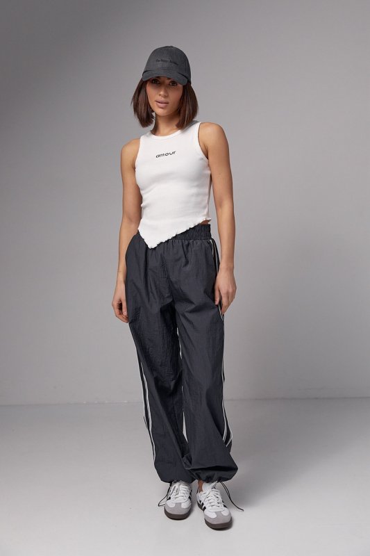 Ця модель із трикотажу в рубчик стане головною родзинкою твоїх аутфітів завдяки асиметричному фасону. На спинці виробу низ прямий, а спереду - асиметричний. Кругла горловина та пройми обшиті окантовкою в тон. Спереду майку прикрашає вишитий напис Amour.