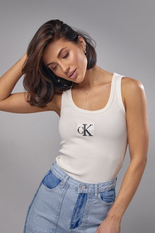 Ця модель на широких бретелях йде з прямими краями внизу. Кругла горловина та пройми обшиті окантовкою в тон. Спереду майку прикрашають паєтки та вишитий напис СК.