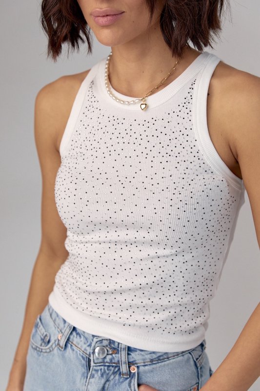 Майка жіноча в рубчик прикрашена термостразами - 03262 молочна