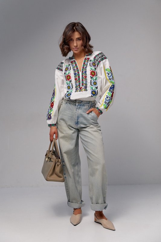 У моделі довгі рукави-реглани складаються з двох частин, і повністю декоровані квітковою вишивкою хрестиком. Вузькі манжети на ґудзику внизу рукавів та окантування широкої горловини в сорочці прикрашені вишивкою. Спереду горловину доповнює невеликий виріз, який обрамлений вишитим прямокутником і з боків прикрашений великими квітами. Краї низу у виробі прямі.