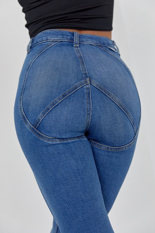 Родзинка цієї моделі – кругла кокетка ззаду, яка підтягує і піднімає сідниці, роблячи їх спокусливими. Конструкція таких джинсів візуально подовжує ноги і робить фігуру стрункішою. Застібка – центральна, на металевих гудзиках, які прикриті гульфіком. Спереду розташовані зручні бічні кишені. У моделі відрізний пояс із шльовками.