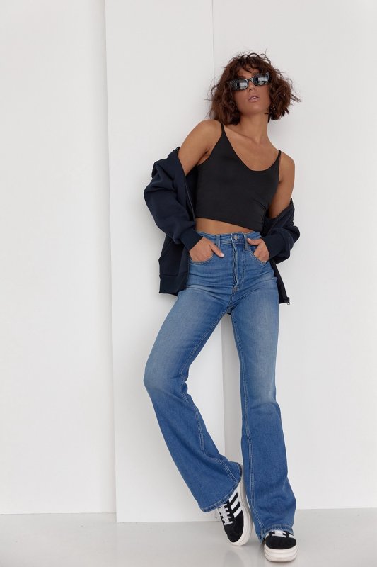 Джинси кльош – чудова альтернатива звичним палаццо. Flared jeans можна комбінувати з укороченими худі і світшотами, в'язаними светрами і водолазками, а також з піджаками в чоловічому стилі.