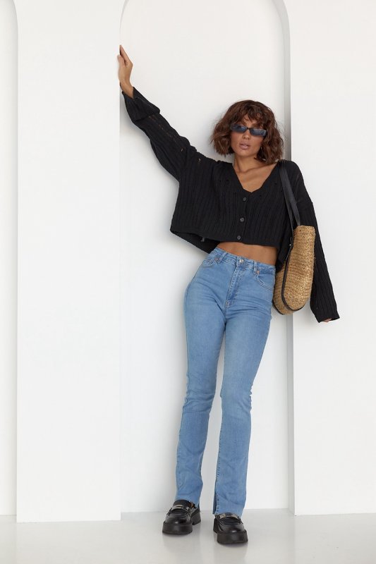 Завдяки високій посадці, джинси візуально подовжують силует. Застібаються на блискавку. Приточний пояс зі шльовками застібається на металевий гудзик. Спереду розташовані зручні бічні кишені. На задніх половинках штанів є кокетка та накладні кишені. Головна особливість моделі – необроблені нижні зрізи та розпірки у крокових швах, ніби хтось узяв ножиці та просто розрізав штанину.