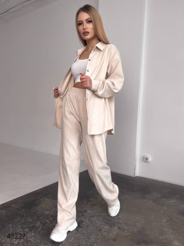 Жіночий брючний костюм з сорочкою 43227 світло-бежевий