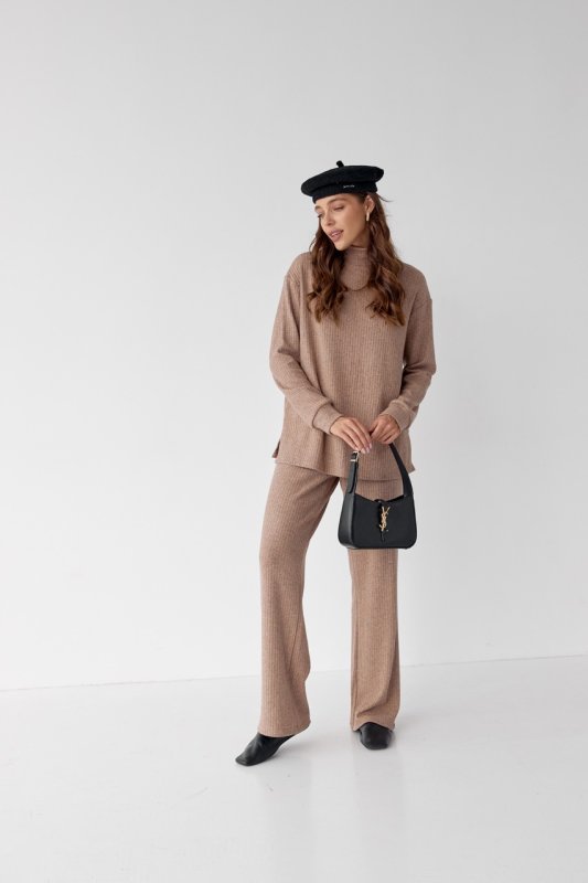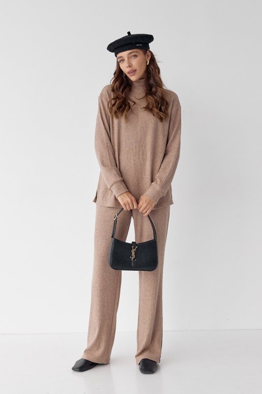 Жіночій костюм прямі брюки і светр. Светр довжиною до рівня стегон, по низу розпірки. Рівень плеча спущений, рукава втачні, довгі, по низу манжети. Спинка з середнім швом. Виріз горловини круглий, комір стійка. По низу светра прокладена строчка. Штани прямі, довгі, на талії пояс із резинкою. Кишені з відрізним бочком. По низу штанок і на поясі прокладені строчки.