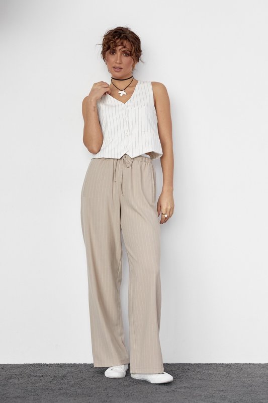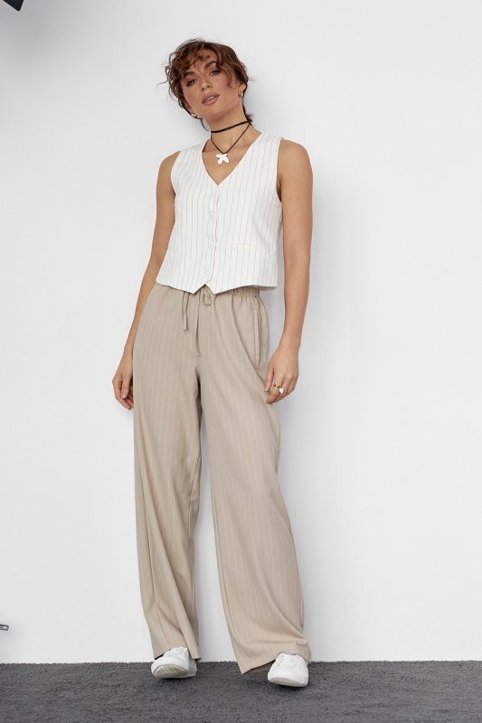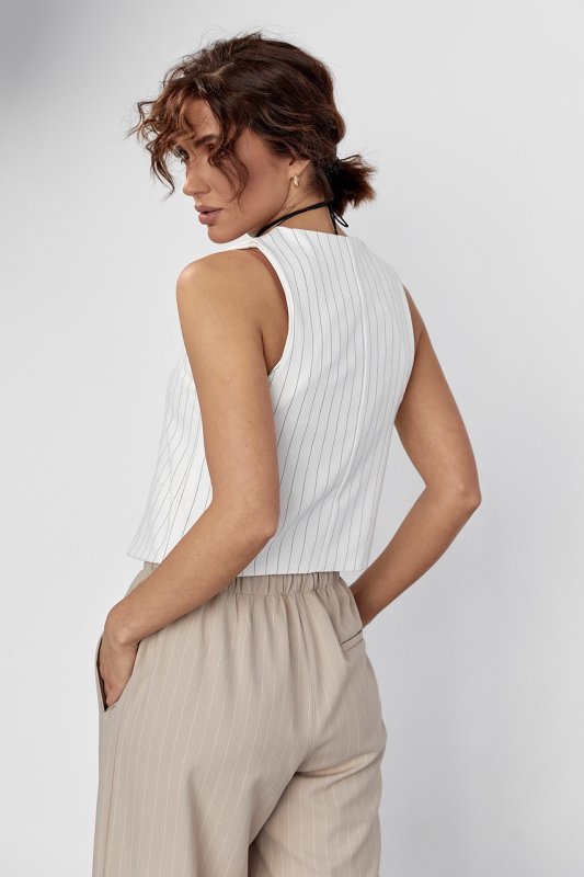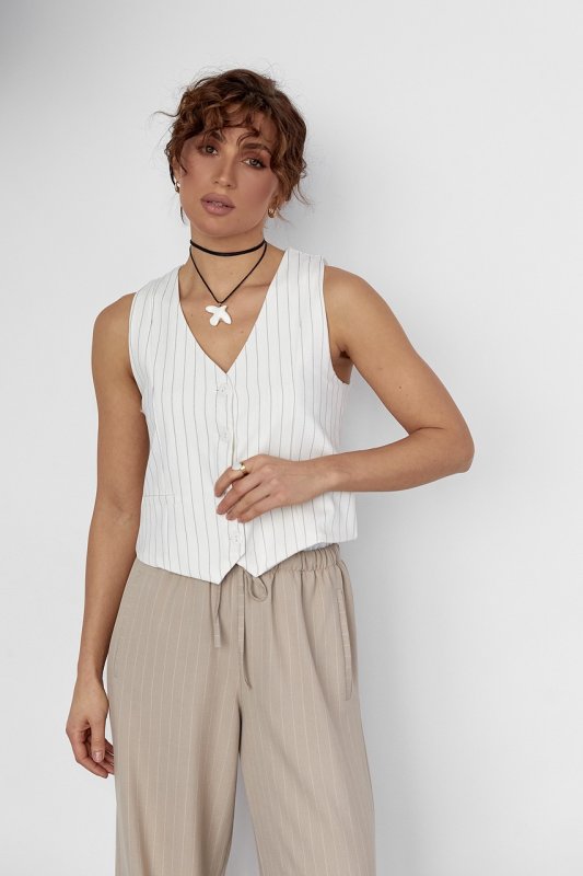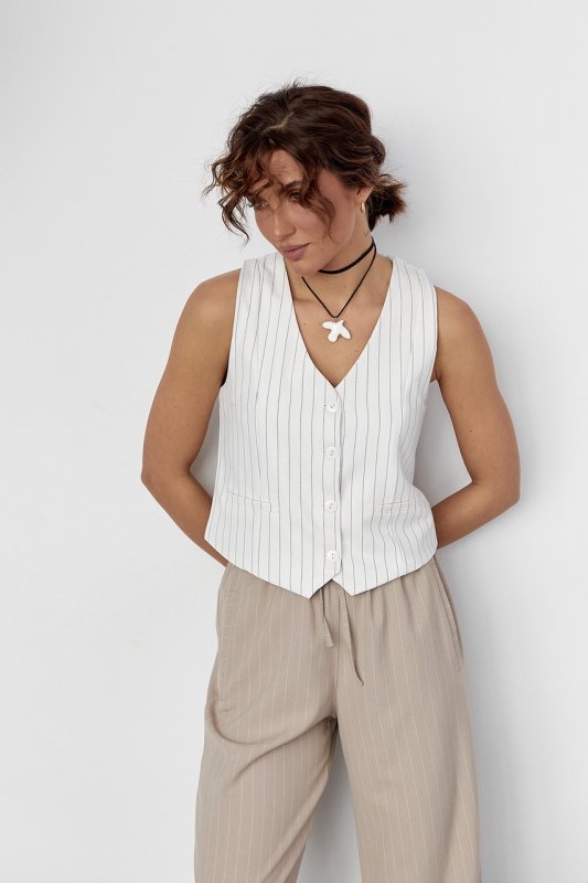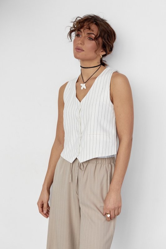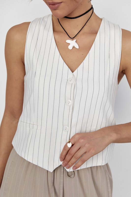 Створювати елегантні образи і для робочих буднів, і для особливого випадку тобі допоможе стильний жіночий жилет з костюмної тканини у смужку.